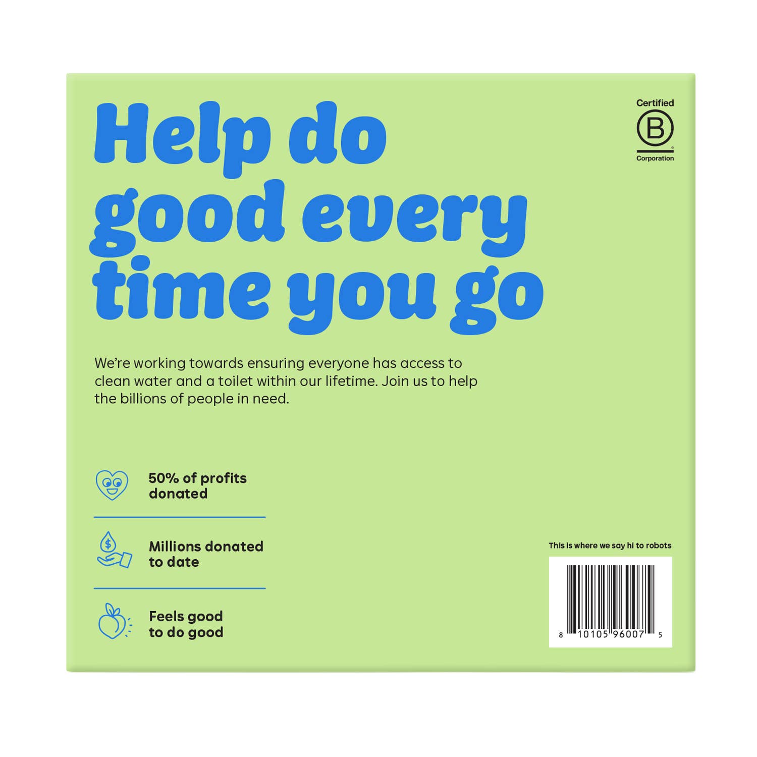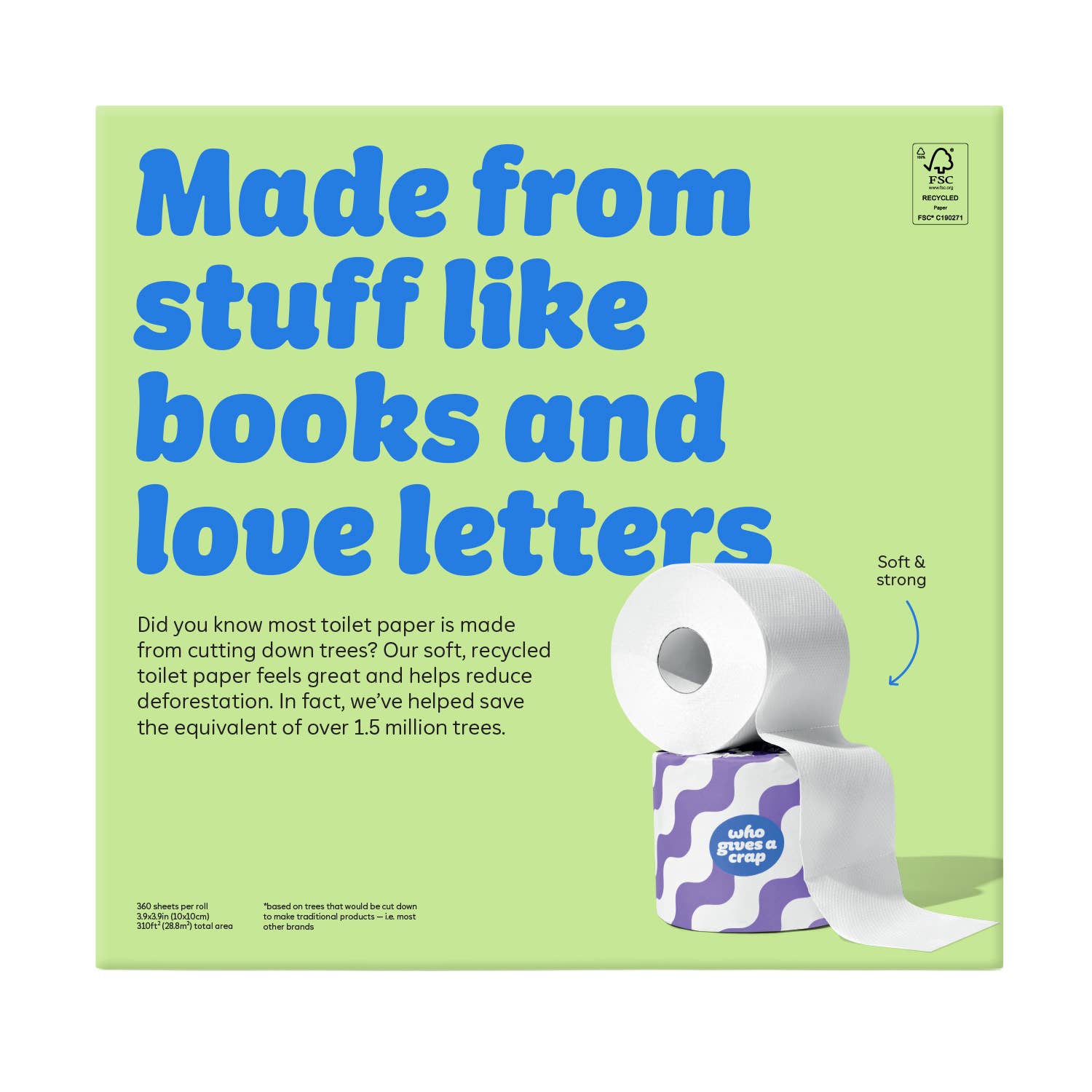 Super strong and soft 3-ply - Made from FSC Certified 100% recycled paper - 20% more sheets than the average roll - Colorful plastic-free box with window cutout - 360 sheets per roll - 50% of profits donated